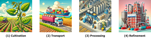 At first glance, it might seem that long distance transportation of soybeans would be the major contributor to the emissions. However, the analysis shows that land use changes – particularly deforestation – have a much greater impact. The carbon emissions from clearing land for agriculture often exceed those from transporting the soybeans significantly. In fact, one hectare of rainforest can store approximately 600 tons of CO22, which is released immediately as when the area is deforested. This deforestation impact accounts for 80 % of the total emissions, equating to 4 kg of CO₂ per kilogram of soybean oil (see Figure 4).