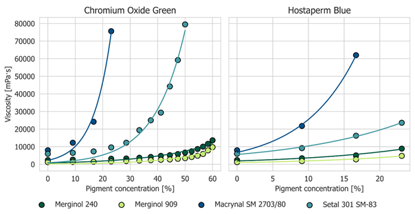 Figure 2 Viscosity of binders as a function of pigment concentration. Plant-based binders (Merginols) maintain low viscosity even at high pigment loadings – without the need for added solvents.
