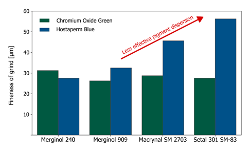 Figure 3 Fineness of grind after 5 minutes of dispersion. All binders perform similarly with the inorganic pigment, but Merginols outperform petrochemical binders with the organic pigment.