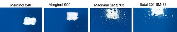 Figure 4 Surface appearance of dried films with Hostaperm Blue. Merginol-based systems yield smooth, glossy films, while conventional binders show visible defects such as orange peel and agglomeration.