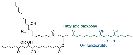 Figure 1 Representative chemical structure of Merginols, showing the hybrid nature of a fatty acid backbone (alkyd-like) and hydroxyl functionality (acrylate-like).